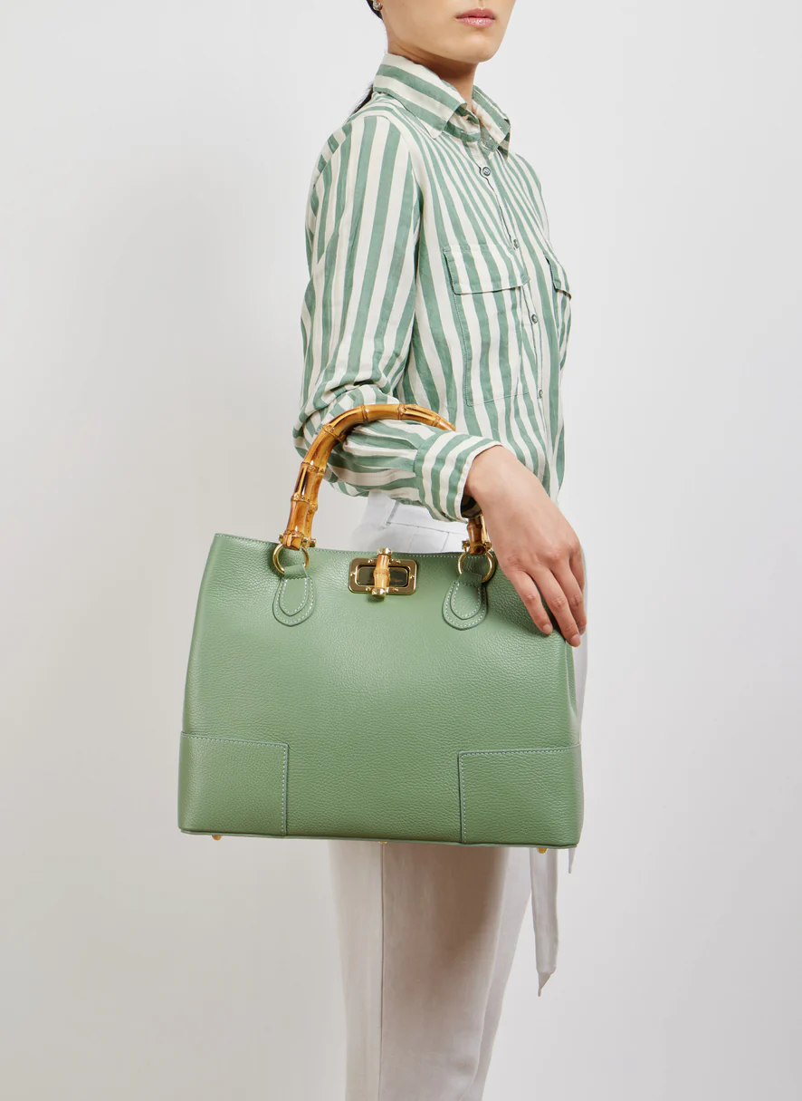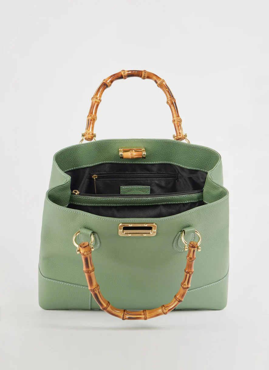 Bamboo Babe Tasche aus echtem Dollaro-Leder, hergestellt in Italien, mit hellgoldenen Accessoires und Bambusgriffen.
