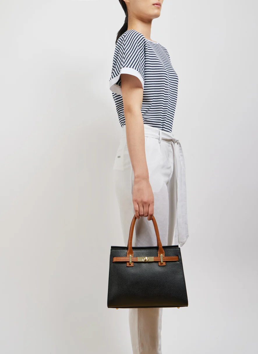 Die Grace Bag verkörpert raffinierte Schlichtheit. Ihr klares, elegantes Design wird durch goldene Accessoires veredelt, die ihre Eleganz unterstreichen. Mit ihrer klassischen Form und den komfortablen Henkeln vereint diese Tasche Funktionalität und Stil.